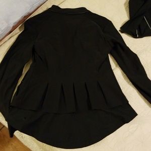 Lululemon fitted peplum jacket in black scuba. Detachable good with reflective stripes. Optional fluted sleeves, and the cutest pleats at the back to emphasize a cute bum. I HAD to have this when I bought it, but it doesn't fit me. I'd love to see another LULU LOVER wearing it! No size markings, but tight on an 8. I'd say, 4 or 6 would be ideal.