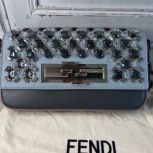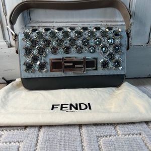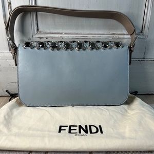 Selling this extremely rare Fendi Crystal Studded Baguette in a beautiful baby blue and charcoal with beige straps. Adorned in crystal studs all throughout the top of the bag. Perfect for the fall and winter season. Currently not online anywhere.