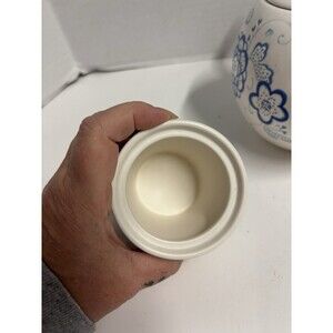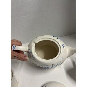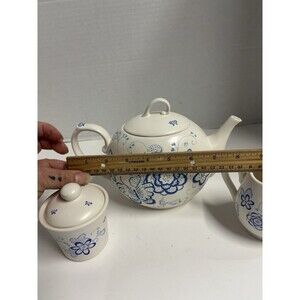 This rare Hallmark teapot, sugar bowl, and creamer set features a beautiful floral pattern and a butterfly theme, perfect for all occasions. Made of ceramic, the set includes a teapot with a round shape and 4 cups, along with a sugar bowl and creamer. The multicolor set is machine washable and dishwasher safe, making it easy to use and clean. With its French country style and unique design, this set is a charming addition to any kitchen or collectible display.