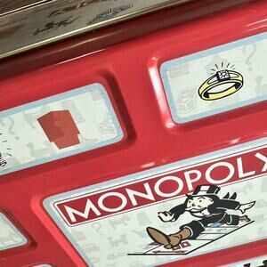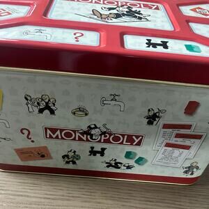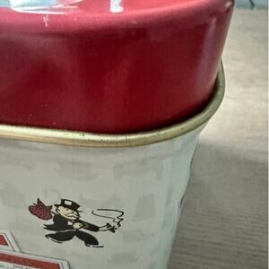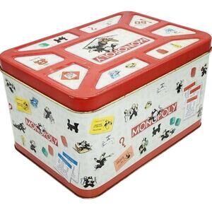 This stunning tin chest was created in 1998 as advertising for the Hasbro game of Monopoly. It was filled with popcorn and also advertised as a tin toy chest. Because of using these as toy chests, few remain in such great condition, if at all. This would also be great in a retro kitchen for a bread box or in your kid's room for décor and storage. The lid lifts up and off. The interior is very clean with no rust. There is some light wear, small scratches,  but it is free from any of the dings and dents that most other vintage tins have after 25 years. This is a spectacular collectible in amazing condition! Measures approx. 13" x 9" x 7". Guaranteed to be as described and shown.