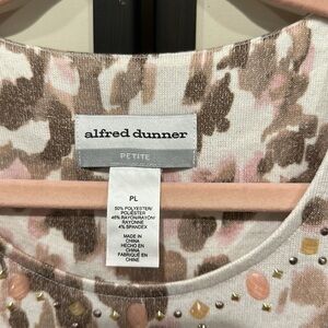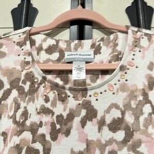 Extremely soft Alfred Dunner top. Embellished around the neck. Mauve and tan on crème color. Pit to pit 23”. Length 25”. A little asymmetrical on sides.