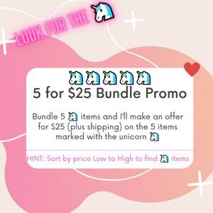 Eligible for 5 for $25 promotion. Bundle five items marked with the 🦄 unicorn emoji, and I will offer you $25 sale price on the five items together plus shipping. Also can do 3 🦄 items for $15 or 4 🦄 items for $20 plus shipping.