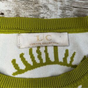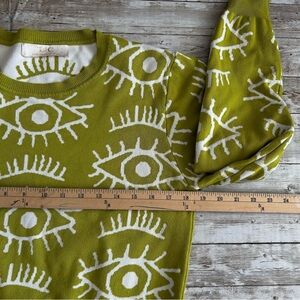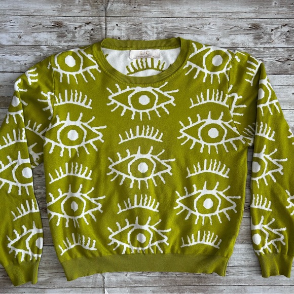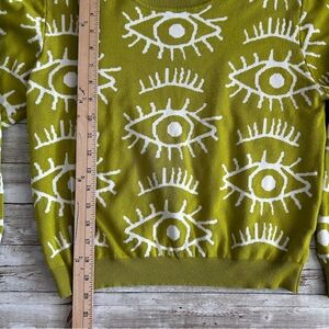 Stylish green sweater featuring a unique eye pattern. Perfect for adding a bold touch to your wardrobe. Fits very small, so more like a med size.