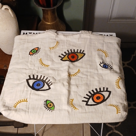 Stylish tote bag with colorful eye patterns. Features orange, blue, and green accents on a cream background. 22X19