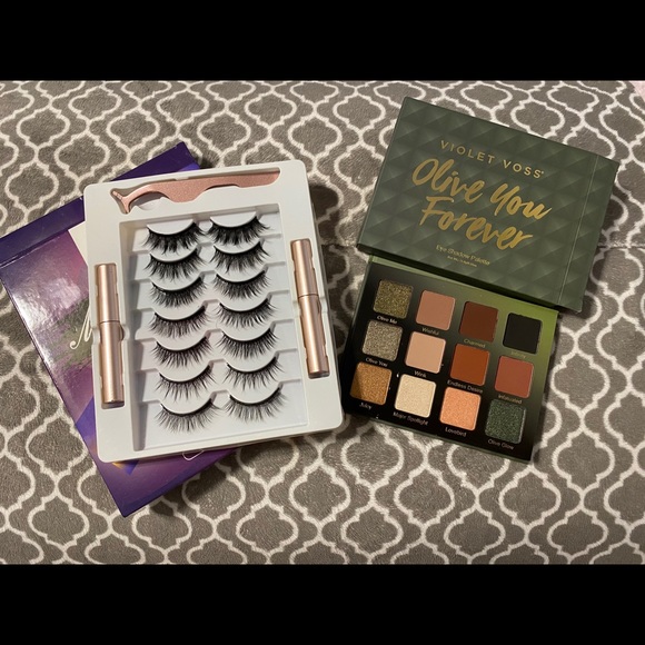 Set of 7 styles of magnetic eye lashes, and the beautiful violet Voss eyeshadow palette olive you forever. New in box, from pet free home.