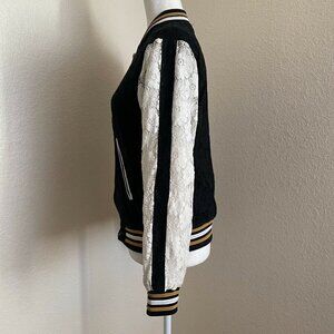 Eye of the Needle Black & White Lace Overlay Full-Zip Bomber Jacket Size Small.
