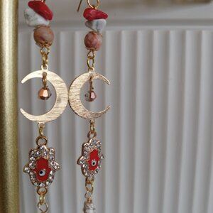 Tarnish Resistant Gold Plated Moon Earrings With Eye-Catching Rhinestone Hamsa Hand and Evil Eye Charms, Red Agate, Howlite, Redline Jasper, and Wire Wrapped Howlite.