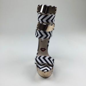 Hardware: Distinctive gold metal plates or buckles decorate the wide ankle straps, and a matching gold plate is located on the front of the platform.