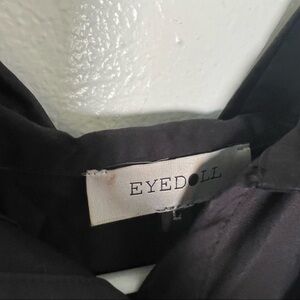 Great condition. Eyedoll. Button down swing blouse. 3/4 sleeve. Solid black with sparkle mesh hem. Collared. Size large. 70% cotton, 30% polyester. Pit to pit laying flat 25” Shoulder to hem 23” Sleeve (pit to hem) 12”. All measurements are approximate and taken lying flat. Smoke free home. No trades, offers welcome.