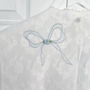 Sheer peignoir short robe overlay with lace, embroidered bow, and rossette details at the bodice. Scallop hems at the sleeves and neckline. Button upper with cinched waistband. 100% nylon. Union-made. I'm guessing it's 1950's.
