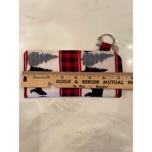 Eyeglass Case Distressed Flannel Look w/ Leaf & Moon Charms on Keyring Red Black Buffalo Plaid Checked Fabric with a wolf and bear. Very Cabin Colorado Ski Resort look.