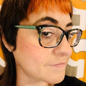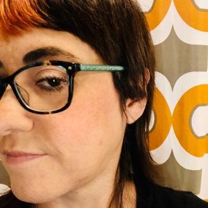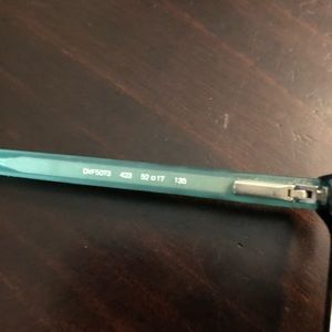 Diane Von Furstenburg eyeglass frames. Beautiful aqua color with silver rhinestones alongside make these frames. The frames are a variety or colors all marbled together with blues, yellows and browns. Love these frames but I have so many already. These do have a prescription but unsure what it is.