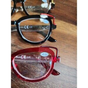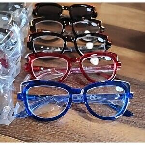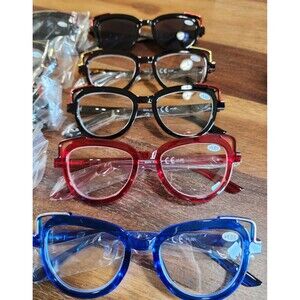 Great cat eye design. 2 of each color combo- Blue, red, black, tortoise shell readers along with 2 pair black reader sunglasses.