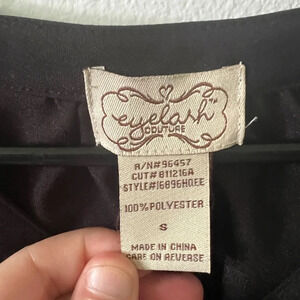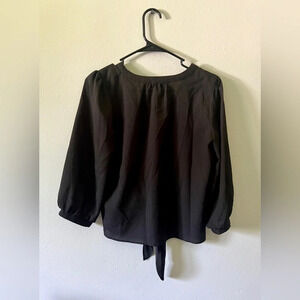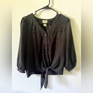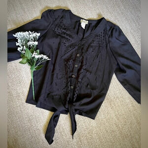 Eyelash branded blouse with laser cut-out detail, tie front, semi-balloon style sleeve, v-neckline, with button down closure.