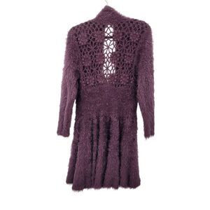This stunning purple cardigan dress combines warmth and style with its fluffy texture and intricate floral crochet back. It's a versatile addition to any wardrobe, offering elegance and comfort in one beautiful piece. The long sleeves and rich color provide a sophisticated look that can effortlessly transition from day to night.
