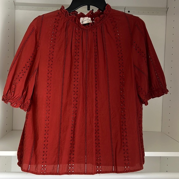 Burnt Orange color. Ruffle collar and trim on sleeves. Eyelet embroidery on both sides.
