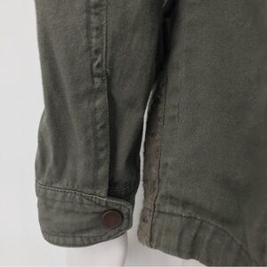 Hips. Total of 4 pockets. Copper zipper with snaps as well. Drawstring at waist and bottom. Sometimes utility jackets are kind of stiff and uncomfortable, this one is not! Really soft material! Snaps at wrists. This is a khaki olive color. Size medium, Happy to give measurements upon request!