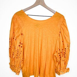 Yellow eyelet lace top with 3/4 puff balloon sleeves. Nice and airy so perfect to wear in the summer, style with jeans or pants. Very good condition, never been worn before. Loose fitting with scoop neckline.