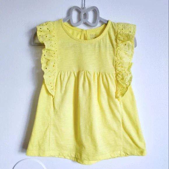 Charming yellow top with eyelet ruffle sleeves. Ideal for bright days. Back button closure