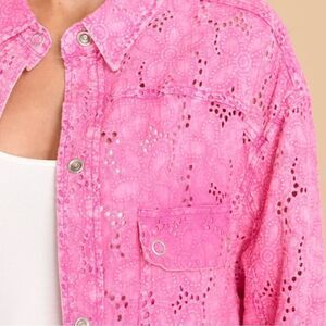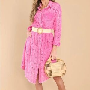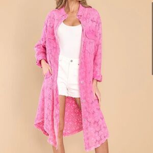 Eyelet Dress. Features a collar neckline, snap buttons down the front, two functional breast pockets, long sleeves with button cuffs, and textured eyelet lace design.