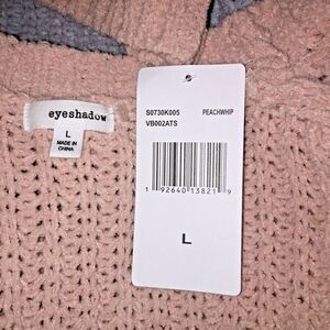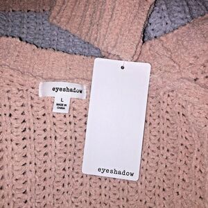 Cozy and stylish Eyeshadow brand sweater in size Large. Features a chunky knit pattern with colorblock design in pink, beige, lime green, and light blue stripes. Perfect for casual outings, layering in cooler weather, or adding a pop of color to your wardrobe. New with tags, made in China. Ideal for a relaxed weekend look or a fun, casual office outfit. Keywords: eyeshadow, colorblock, chunky knit, striped sweater, pink, green, blue, oversized, casual, cozy, winter, fall, layering