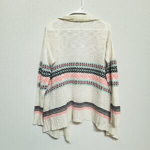 Stylish cream cardigan with vibrant pink and teal stripes. Perfect for layering.
