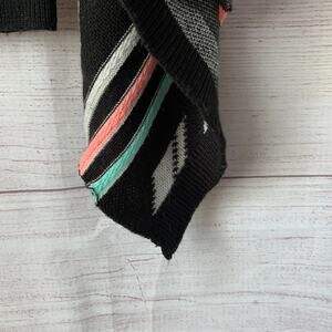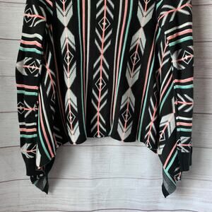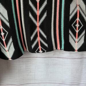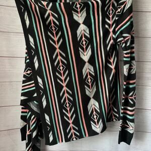 Geometric print cardigan sweater by Eyeshadow. This long sleeve open front cardigan has a black base with white, teal, and pink in the aztec, tribal, or geometric pattern. The sides are squared so that they hang asymmetrically at the bottom. It has a stitched but raw-like bottom hem. It is pre-owned with light pilling but is in great condition.