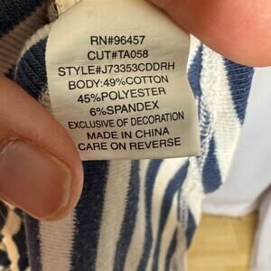 This Eyeshadow women's short sleeve top in size Small features classic navy and white horizontal stripes, a flattering V-neckline, and an on-trend tie front hem. The scalloped sleeves are detailed with delicate embroidered eyelet lace trim, adding a feminine and boho touch. Made from a soft and stretchy cotton-poly-spandex blend, this top is lightweight and perfect for casual wear. Excellent pre-owned condition with no visible flaws.