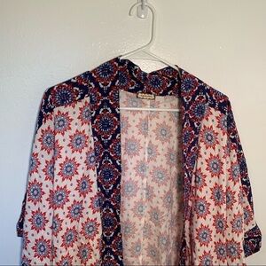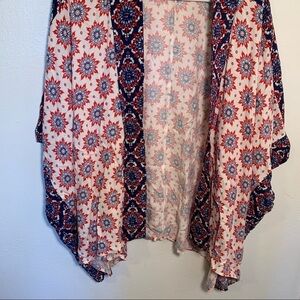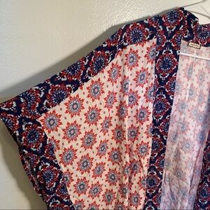 Great condition. Eyeshadow. Open circle kimono. White with red and blue starburst floral/geometric pattern. Short sleeve. Style J50958RACC. One size. 100% rayon. Measurements available upon request. Smoke free home. No trades, offers welcome.