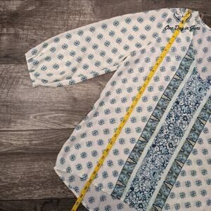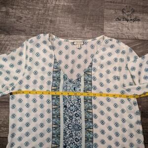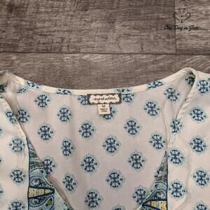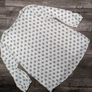 This whimsical white and blue V-neck top, oh what a delight, with sheer fabric so airy and light! New without tags but pristine as can be, an Eyeshadow pullover that's fancy and free!