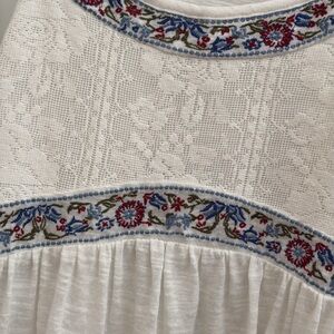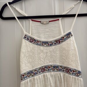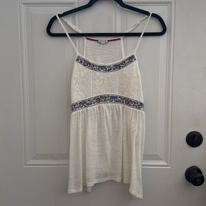 Eyeshadow top/tank top with adjustable straps. Patterned on chest. Size Small. White with blue/red trim at chest. Great condition.