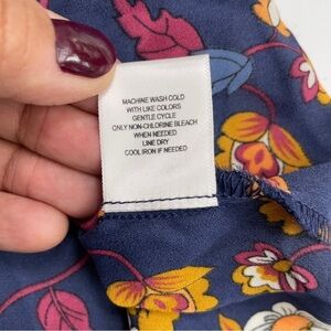 Beautiful Eyeshadow blouse in a rich navy/blue base with an allover floral print in mustard, orange, white, and pink. Features a feminine ruffle yoke and layered ruffle/ flutter short sleeves that give it a soft boho vibe. Easy pullover style with a relaxed, flowy fit — perfect for work, brunch, or fall layering.