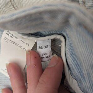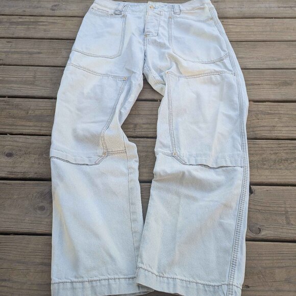 100% cotton workwear style jeans from alt Swedish fashion brand. 34 waist 32 inseam. Some stains, but as you can see from pics it's barely noticeable.