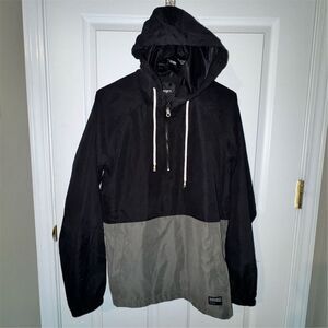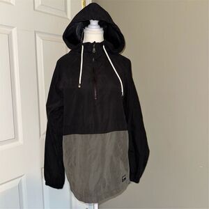 Keywords: Ezekiel, windbreaker, men's jacket, size small, black and gray, hooded, pullover, 3/4 zip, casual wear, spring jacket, lightweight, breathable, machine washable, rugged, manly, colorblock, two toned, neutral, Streetwear, everyday wear, layering piece, travel jacket, fall jacket, minimalist, athletic, athleisure, urban fashion