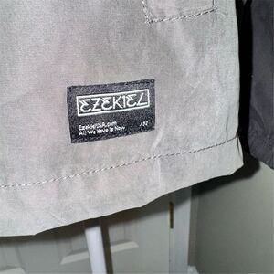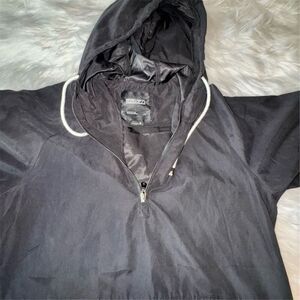 The Ezekiel windbreaker is a size small, black and gray hooded pullover designed for men. Made from 91% polyester and 9% nylon, it features a drawstring hood, front pockets, and a 3/4 zip closure and elastic cuffs. This lightweight and breathable jacket is ideal for casual occasions, particularly in the spring. It is machine washable for easy care.