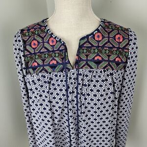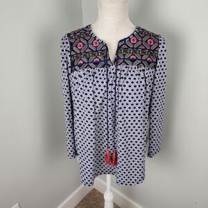 Ezra Cubella Aztec Embroidered Hi Low Hem V Neck Tassled Top Size Small