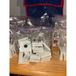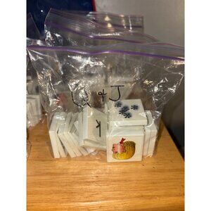 Bag: 12" x 10" x 2", Tiles: Approx. 1.5" x 1.5". Minor wear on bag, tiles in good condition.