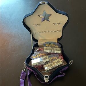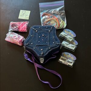 Charming starry denim bag for kids, featuring a vibrant purple strap. Perfect for carrying small accessories in style.- comes with some fun stuff inside that fits nicely.
