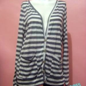 Versatile striped cardigan with front pockets and buttons. Perfect for layering. Lightweight.
