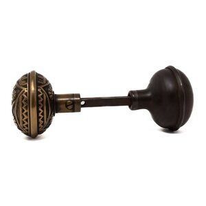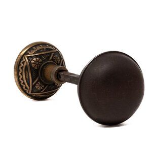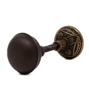 Made by F.C. Linde in the 1885 catalog. Highly decorated bronze doorknob set. Eastlake style with a filled background and floral motifs in the middle. The decoration is repeated on the backside of the knob