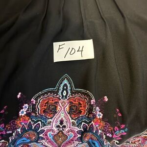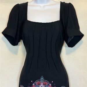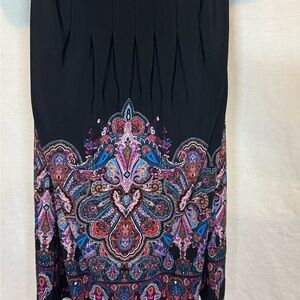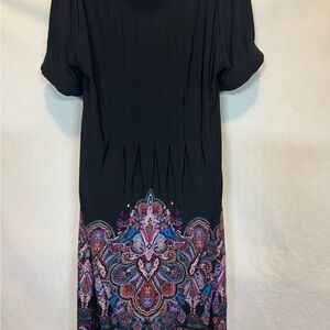Ice Black with colorful print at bottom, Square beck, Pleated neckline, Short Sleeve, Pullover, Mid length Dress. Business casual. Lightweight. Dressy feel. Slightly stretchy. Polyester & spandex blend material. Gently used with no stains or flaws.