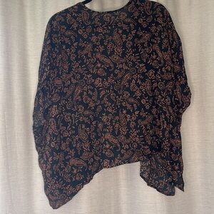 F21 BLACK AND RUST PATTERNED KIMONO SHAWL