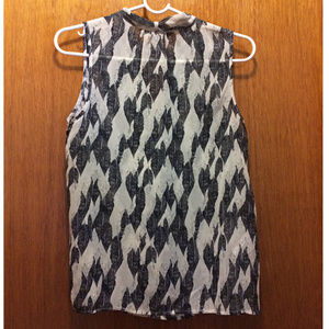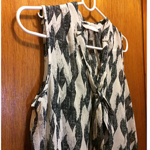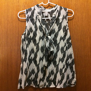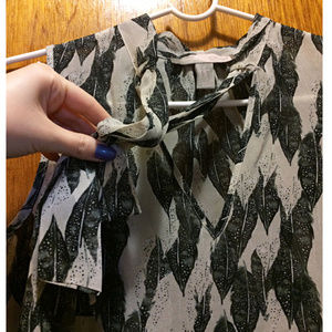 This sleeveless sheer blouse features a black/gray feather print over white chiffon material, v-shape dip in the neckline, with a self-tie bow, a.k.a. pussybow in the front. Machine washable, 100% polyester. Size XS with a relaxed fit.