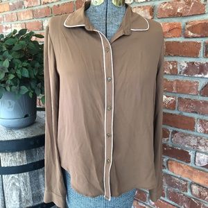 Long Sleeve forever 21 contemporary brown button down shirt with white pin-striping down the sides of the buttons. Very cute business or office attire top.