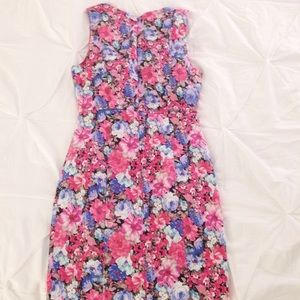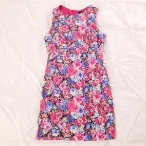 Beautiful pink floral day sheath dress. Worn only twice. I've received so many compliments when wearing this dress! Pink interior lining throughout the entire dress. Stretchy material that is perfect for when eating out and getting that food baby! :) 75% cotton, 23% polyester, 2% spandex. For reference, I'm 5'2" and about 105 lbs.