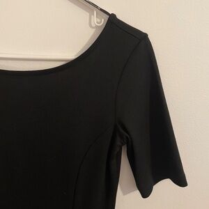 Forever 21 skater dress in black with a single tan stripe. Pleated skirt and half sleeves. Open back. Lots of stretch. Has loops for a belt but does not come with a belt.