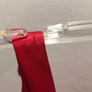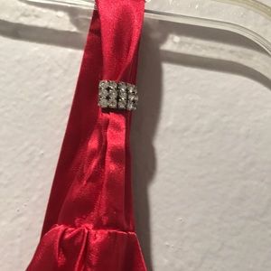 Shiny red top with rhinestone detail for a fun night out! Small hole on left shoulder, as pictured, but not noticeable when worn. Otherwise in great condition!