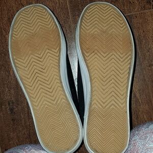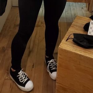 Black, comfortable lace up platform sneakers with white tips and white shoelaces. These are in good condition. Very comfortable and versatile. Gently used.