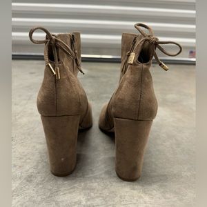 Forever 21. Tan suede like bootie. Cute peek a boo in the back of the boot with a bow. Comfy boots. Side zipper