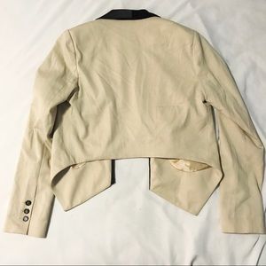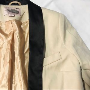 Cream, light beige cropped blazer with black trim. Super cute and chic! Silky soft lining inside. Button detailing on the sleeves. One small pen mark on the shoulder, as seen in the photo.